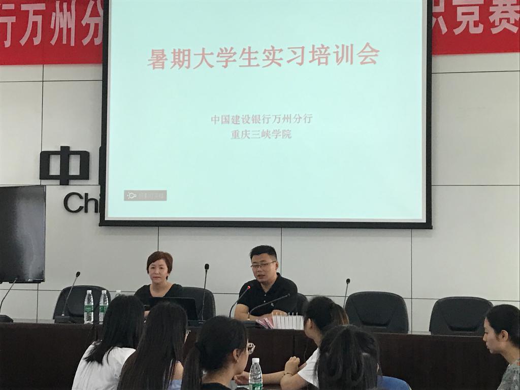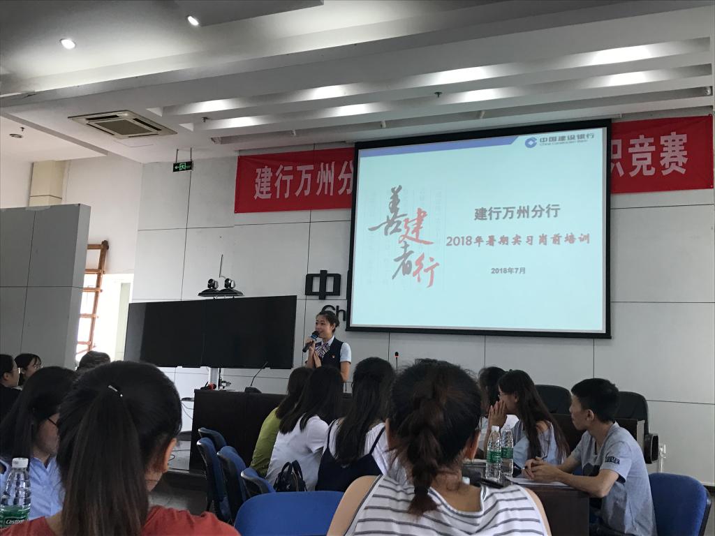 2018年7月7日上午,新葡的京集团350vip8888与建行万州分行2018年暑期实习培训大会在建行万州分行高笋塘支行举行。建行万州分行个金部经理李锦竹,江南分理处网点负责人何敏,总支副书记骆孟鑫,辅导员廖安超,建行相关工作人员,全体实习员工参加了培训会。