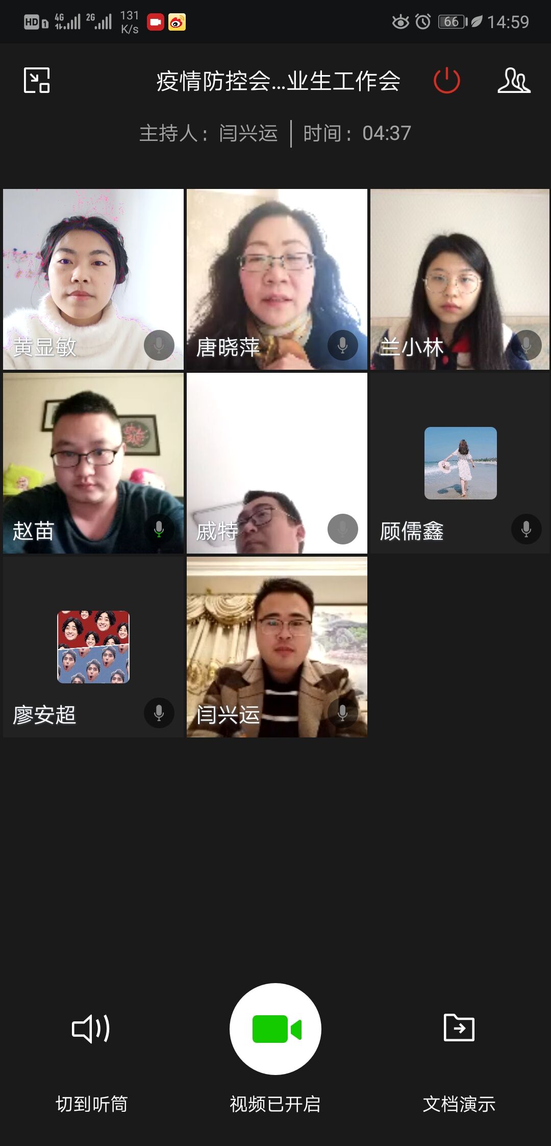 2020年3月8日下午三点整,新葡的京集团350vip8888书记唐晓萍组织公司学工队伍成员召开了疫情防控兼毕业生工作视频会议,本次会议共计4个议程。首先是各位辅导员就各班疫情防控情况、文件精神传达情况、网上课程学习情况、班团建设情况等作详细汇报,以期在汇报总结中更好地开展下一步工作;其次是学工办代理主任闫兴运就公司疫情总体情况作汇报,通报疫情防控以来目前还存在的问题,并提出相应的整改措施,以保证后续疫情防控工作有序开展;再者是毕业班辅导员戚特和闫兴运对公司毕业生的就业工作现况和考研上线情况作通报,并对下一步网上招聘进行组织安排,唐晓萍书记对此还提出要对各班参与网上招聘作严格考核,激励员工积极参与就业竞争;最后是唐晓萍书记用“三个严格”对近期工作作部署:严格工作要求,从讲政治的角度完成疫情防控工作,管好人、事和数据;严格目标和过程管理,推动公司年度就业工作,从思想、观念、心理等多方面开展就业帮扶;严格责任追究、落实岗位职责,各司其职,在共抗疫情的同时,也有序开展常规工作。