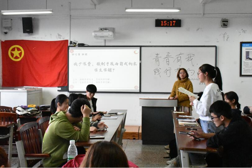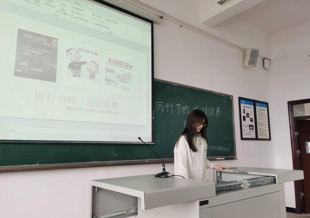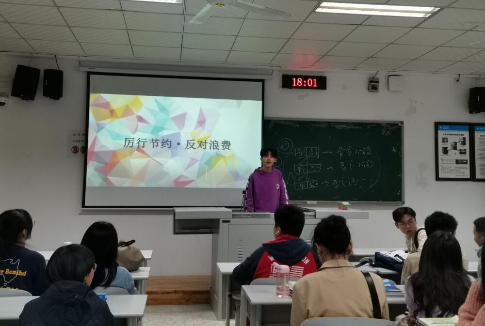 活动以班级为单位进行,由各班团支部书记主持开展,多以演讲、现实案例分析、观看视频等方式向同学们介绍勤俭节约的意义,在活动中团支书也指出了同学们现实存在的问题如:剩饭过多、盲目消费等,并给出相应的建议。