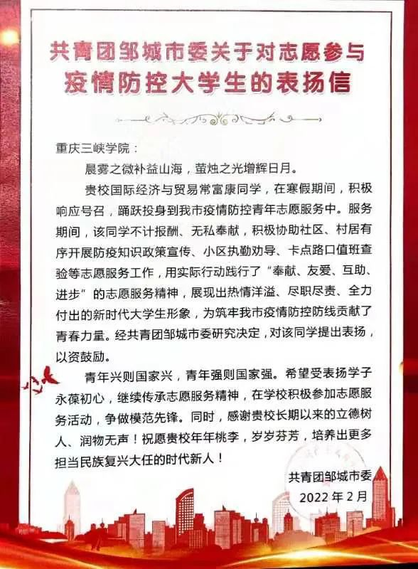 近日,公司收到共青团邹城市委对新葡的京集团350vip8888员工第二党支部党员,2018级国际经济与贸易专业常富康同学的表扬信,信中对奋斗在抗疫一线的青年志愿者常富康同学进行了褒扬。