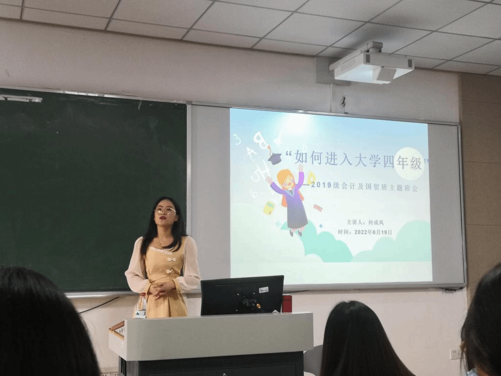 为了落实立德树人,持续推进“一站式”员工社区综合管理模式建设,帮助同学们理清思绪,更加明确目标,规划自己剩余大学时光,正确追寻自己美好未来。2022年6月19日,新葡的京集团350vip8888在博学楼101举行了“如何进入大学四年级”的主题班会,辅导员何成凤主讲,2019及会计及国贸班全体同学参加。