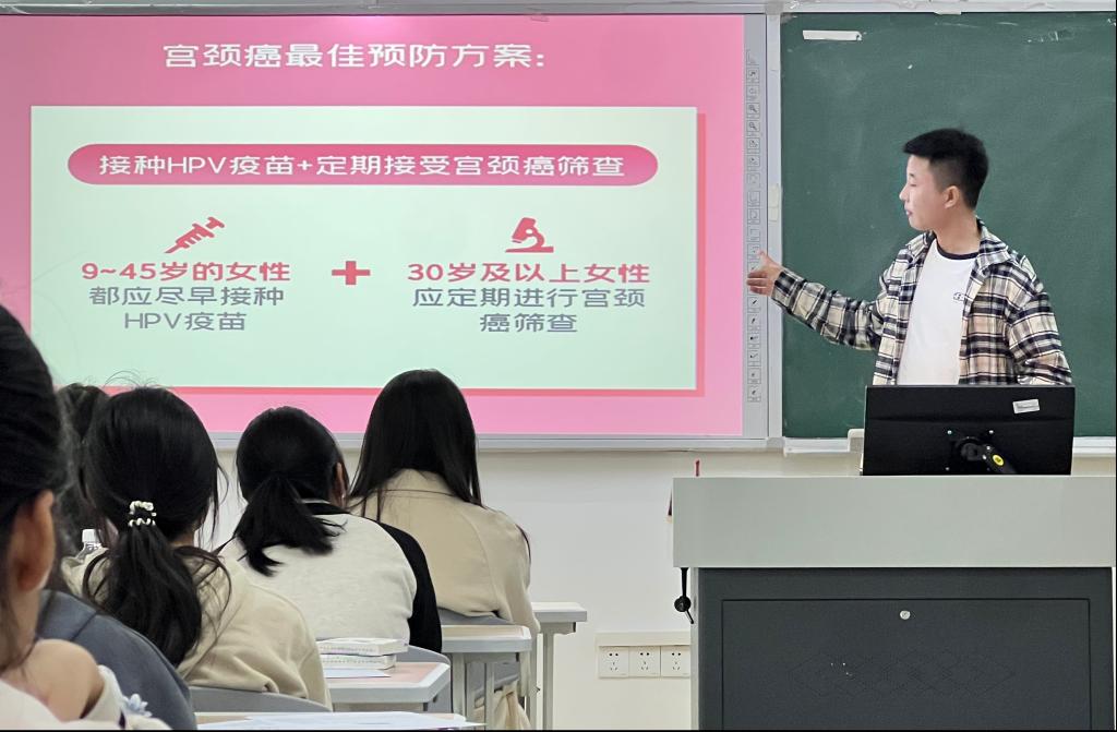 活动现场,宣讲人员针对宫颈癌相关知识进行了系统宣讲,从宫颈癌的基础知识、宫颈癌的致病病因、临床症状、HPV疫苗作用等预防保健知识进行了讲述。在HPV疫苗热门问题解答环节中,同学们踊跃参加。最后,宣讲人员发放了预防宫颈癌的相关宣传资料,让同学们进一步加深对宫颈癌危害健康的认知,持续提高宫颈癌防治知识水平,意识到接种HPV疫苗的必要性。