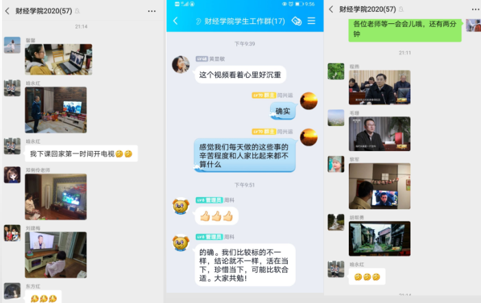 观看过程中,大家感触颇多。以生命赴使命、以决心践初心!今天的两位时代楷模真真是在用自己的所有力气在践行这句话,是他们用柔软的双手筑起了民众脱贫致富的信心、决心和同心。在教师群里,有老师感慨到,较之两位同志的艰辛与困苦,我们的苦与涩根本没法并论。也有老师说到,每个人都有自己的使命与初心,珍惜当下、不负韶华,做到最好的自己、最好地服务他人即可。员工们观看后也是激情澎湃,有的还激动地写下了自己的所感、所悟。有同学说,近一个小时的直播,我看到的,是艰苦的脱贫岁月在可亲的书记脸上沉淀的斑驳痕迹。也有同学说,哪有什么岁月静好,只不过有人替你负重前行,困难面前要学会打破禁锢,将自己的价值与国家民族的价值相结合。