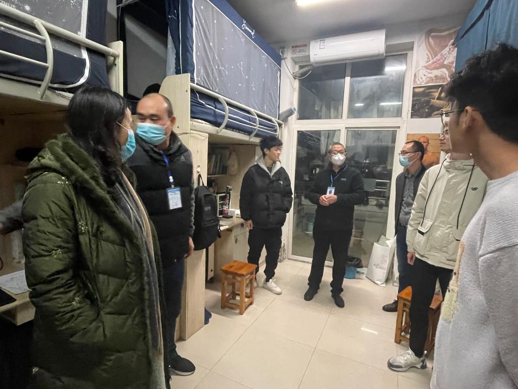 陈文昆副董事长一行来到员工寝室,首先详细询问了解员工生活情况、思想动态和线上教学效果,查看了宿舍安全用电和环境卫生,叮嘱同学们冰雪严寒时节,一定要穿暖一点、吃饱一点,加强好体育锻炼,调整好作息时间,制定好学业规划,强调要树立疫情防控大局观,提高个人防护意识、安全意识,强化自我管理和自我监督,善于甄别网络信息,敢于同错误言论做斗争,学校也会切实提升服务质量,为同学们营造良好的学习生活环境。