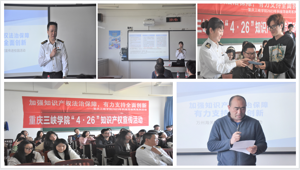 为全面学习贯彻党的二十大精神,落实好习近平总书记关于知识产权工作的重要指示精神,积极推进知识产权海关保护工作。在第23个世界知识产权来临之际,4月26日,万州海关走进公司在明辨楼1栋513教室开展了保护知识产权宣传活动。万州海关副关长李宏春、总支副书记何兴权、万州海关综合业务科科长陈习珍及2020级国际经济与贸易2班全体同学参加了本次活动。活动由何书记主持。